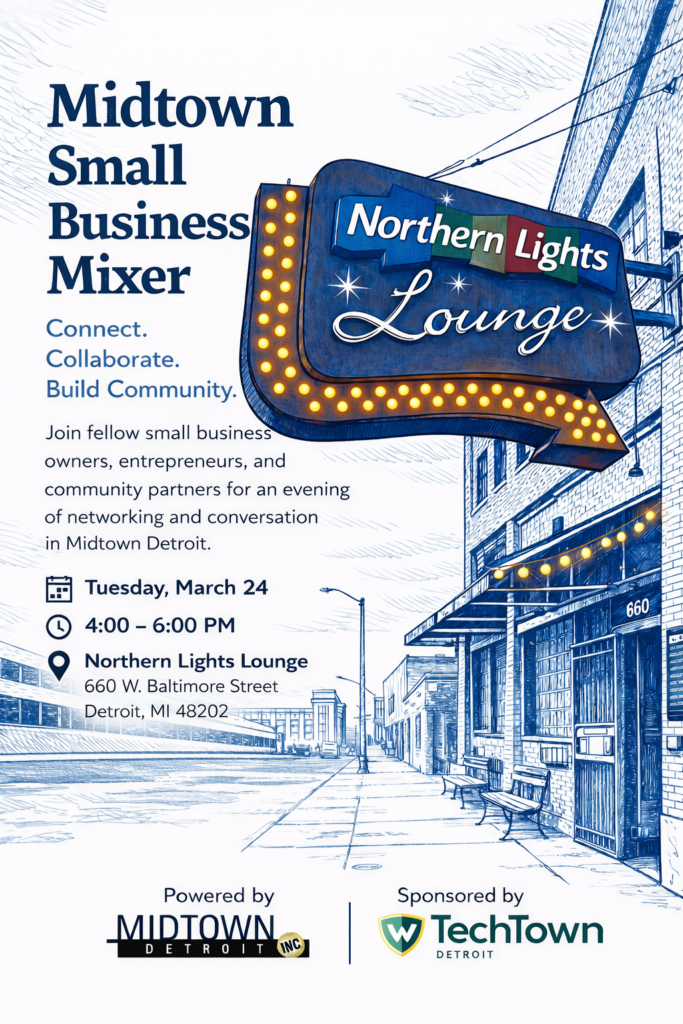 Midtown Detroit, Inc. is launching a Small Business Mixer Series sponsored by TechTown Detroit to help connect small business owners, operators and managers in the Midtown community. Please join us for a happy hour of networking, socializing, resource connections and meaningful conversation.